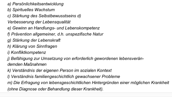 | a) Persönlichkeitsentwicklung b) Spirituelles Wachstum c) Stärkung des Selbstbewusstseins d) Verbesserung der Lebensqualität e) Gewinn an Handlungs- und Lebenskompetenz f) Prävention allgemeiner, d.h. unspezifische Naturg) g) Stärkung der Lebenskraft h) Klärung von Sinnfragen i) Konfliktkompetenz j) Befähigung zur Umsetzung von erforderlich gewordenen lebensverändernden Maßnahmen k) Verständnis der eigenen Person im sozialen Kontext l) Verständnis familiengeschichtlich gewachsener Probleme m) Die Erfragung von lebensgeschichtlichen Hintergründen einer möglichen Krankheit (ohne Diagnose oder Behandlung dieser Krankheit). |